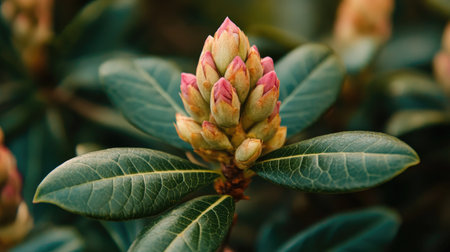 A stunning close-up of blooming rhododendron buds with vibrant pink tips set against lush green leaves. Perfect for nature and floral themes.