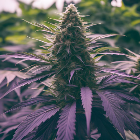 A cannabis plant displays striking hues of purple and blue among its leaves, thriving in a vibrant, natural setting during the day. The colors create a captivating visual effect.