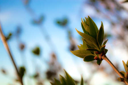 Spring tree bud. Green fresh spring is coming. Green young brunch with blue gentle skyes in the backround.