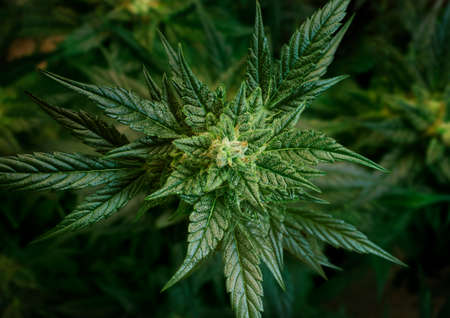 alternative medicine presented by medical marijuana, texture female cannabis bush top view on a dark blurred background, medicinal and narcotic plants, in particular, recreational cannabis close-up