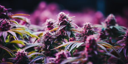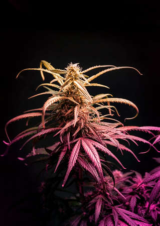 Medical Marijuana plants forming flower buds grown under Purple UV light against black background