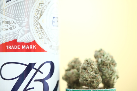 Belarus, Minsk, March ,10 : Budweiser popular world quality beer and medical cannabis marijuana