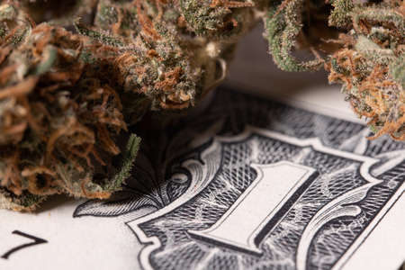 One Dollar banknote with Cannabis buds. Closeup Number One of USD Bill surrounded by Hemp flower