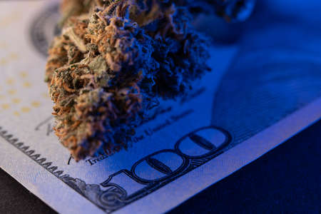 One hundred Dollar Banknote and Hemp bud. Cannabis flower closeup. 100 Dollars. Buying Drugs concept