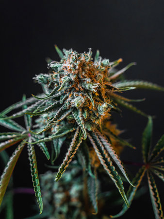 Close up macro of bud on cannabis plant ready to harvest. Car red modern strain.