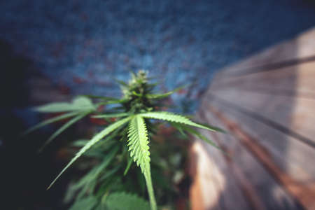Ripe cannabis plant - hemp. Blooming female marijuana flower and leafs growing in homemade garden. Shallow depth of field and blurred background. Illuminated by sunlight. Close-up