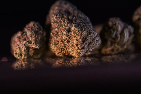 Marijuana buds on a black background with reflection. Macro shot.