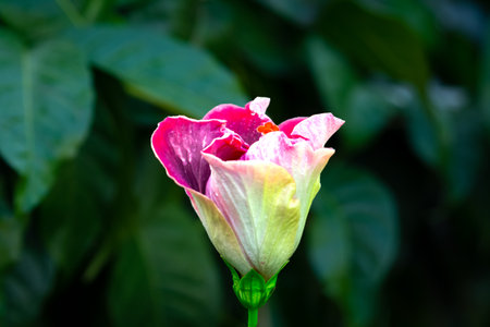 Exotic pink and purple hibiscus flower beginning to open in bloom.