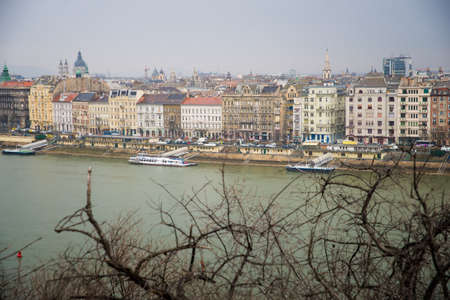 Danube river view of Pest side with Fisherman's bastion, matthias church, and szilagyi dezso square reformed church in winter time