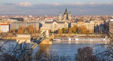 Chain Bridge or Szechenyi Bridge across Danube river in Budapest, Hungary, with old buildings and dome of St Stephen's Basilica or Szent Istvan Bazilika, in autumn.
