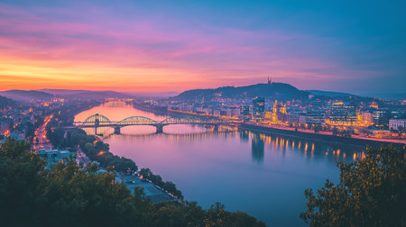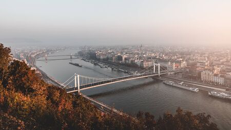 Amazing view of Danube river with famous bridges in autumn morning in Budapest, Hungary