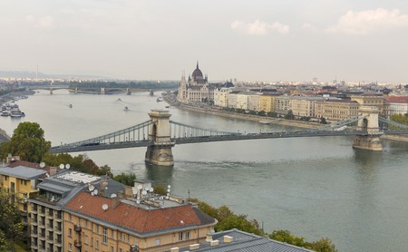 Chain bridge on Danube river in Budapest city. Hungary. Urban landscape panorama with old buildings