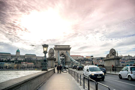 BUDAPEST, HUNGARY - March 19, 2019 : Busy Chain bridge, or Lanchid, in the capital of Hungary, Budapest