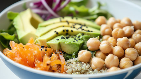 Quinoa, chickpeas, avocado, carrots and other vegetables composing a healthy vegan buddha bowl