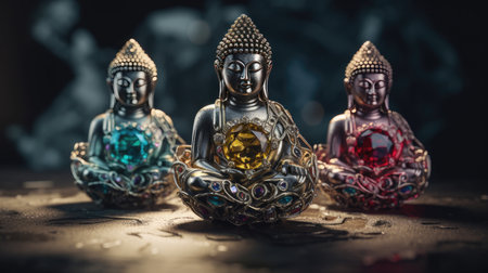 A collection of Buddha statues sitting side by side, embodying serenity and spiritual wisdom.