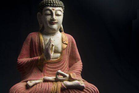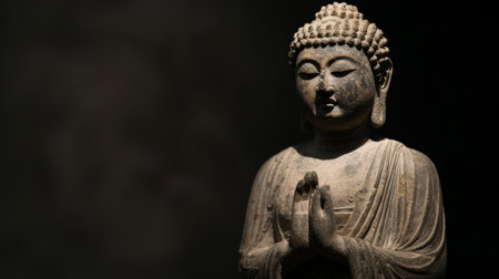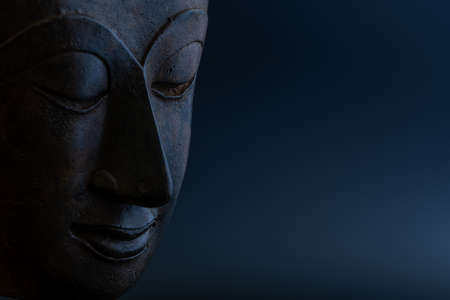 Buddha Purnima and Vesak day concept, Grey Buddha statue with low key light against deep black background close up. Meditation