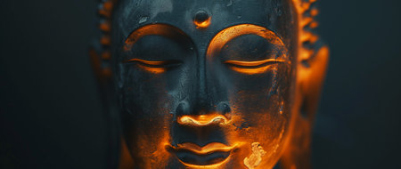 A textured depiction of a tranquil Buddha face is set against a mottled teal and brown background in Italy, suggesting meditation and spiritual calm. High quality photo