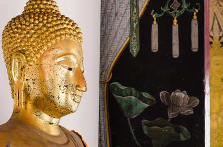 Golden Buddha statue with sunlight used for amulets of Buddhism religion. Buddhism is popular region in China Japan and south east Asia.copy space concept.