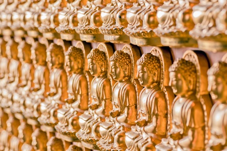 Hundreds of golden Buddha statues background at chinese temple