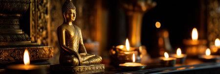 A golden Buddha statue glimmers softly in candlelight, accompanied by flickering candles and a serene atmosphere, inviting meditation and reflection.