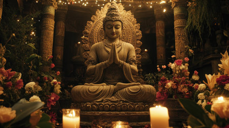 A buddha statue is surrounded by candles and flowers in a serene setting.