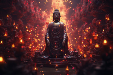 This captivating image features a Buddha statue surrounded by vibrant flowers and flickering candles, creating a serene and tranquil atmosphere ideal for promoting peace and spirituality.