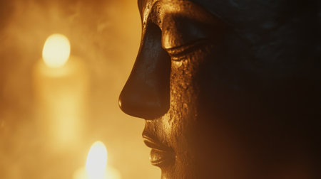 Buddha profile close-up, subtle details of its features visible under the soft, glowing ambiance of candlelight