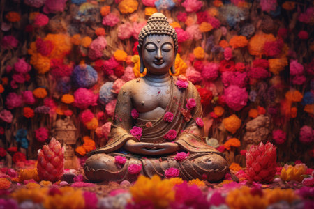 A buddha statue sitting in front of a wall of flowers, Generative AI
