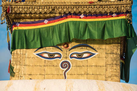 Buddha eyes close up with prayer flags at Bodhnath stupa in Kathmandu valley, Nepal