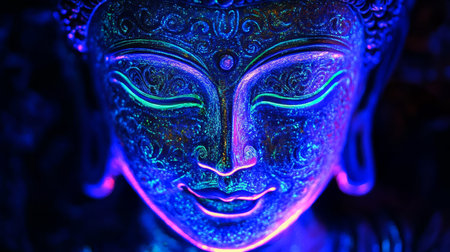 A fluid organic Buddha figure radiates a soft neon blue light, showcasing intricate designs and a serene expression, capturing a tranquil atmosphere.