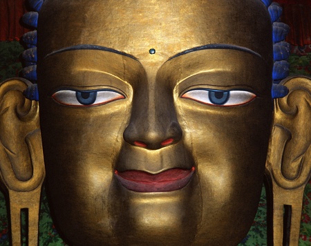 Golden Buddha statue close up, showcasing intricate details of face and serene expression. craftsmanship highlights spiritual significance and artistry of this iconic figure