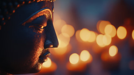 Artistic close-up of a Buddha figurine serene profile, softly illuminated by warm candle flames behind, evoking peace