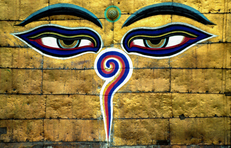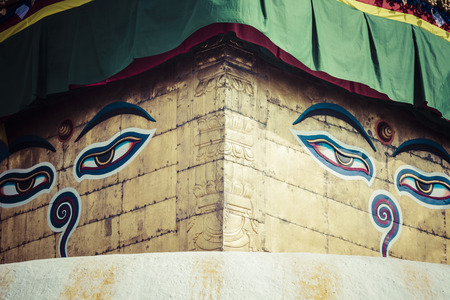Buddha eyes close up at Swayambhunath stupa in Kathmandu, Nepal