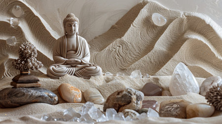 Zen Buddhist meditation garden featuring serene Buddha figurine, stones, and crystals in a tranquil sandscape.