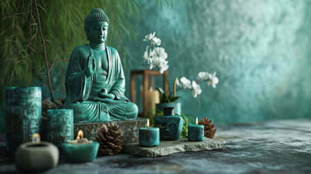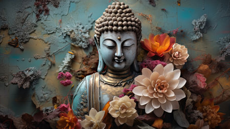 A textured depiction of a tranquil Buddha face is set against a mottled teal and brown background in Italy, suggesting meditation and spiritual calm. High quality photo
