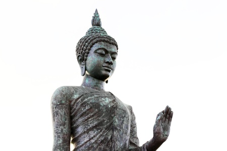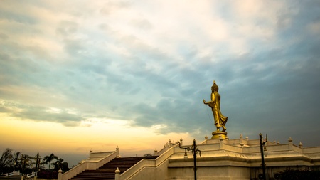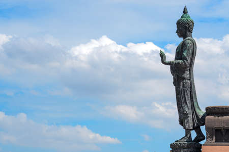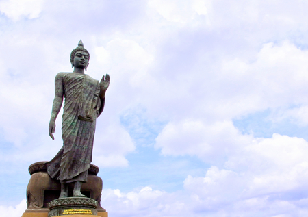Buddha statue standing on the left hand with blue sky background,Buddha statue Thailand