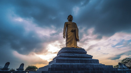 A serene sunset view featuring large Buddha statue silhouetted against vibrant sky. warm colors of sunset create peaceful atmosphere