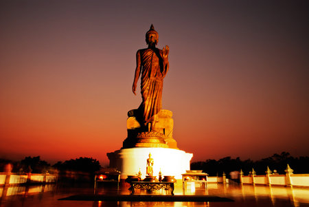 Walking Buddha statue at Buddhamonthon (Phutthamonthon), Buddhist Park in Nakhon Pathom, Thailand, in twilight moment