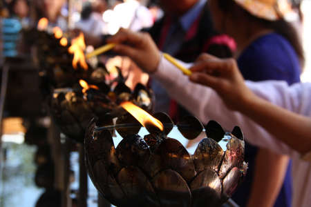 Religious ceremony, flames over bowls, people light candles in temple, Thailand.