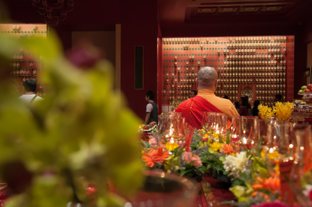 SINGAPORE - 1 Jan 2011: Monk chanting in Buddha tooth relic temple in Singapore. This temple has become a popular attraction within Chinatown.