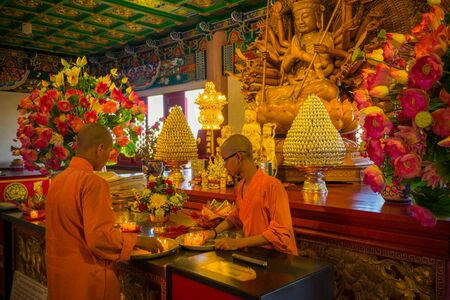 Hue, Vietnam - June 2019: Buddhist monks saying traditional prayer chants before taking their meal in Thien Mu Pagoda