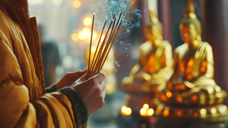 Person Holding Incense Sticks in a Temple During Chinese New Year Celebration. Concept of Cultural Tradition, Spiritual Rituals, Asian Festivals, and Peaceful Meditation. Chinese New Year.