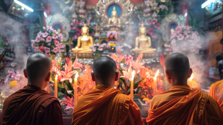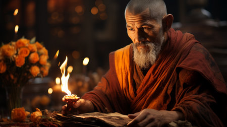 Redrobed monk conducts ancient rituals in spiritual temple amidst tranquil ambience. Concept Religious Practices, Spiritual Rituals, Monastic Life, Tranquil Temples, Ancient Traditions