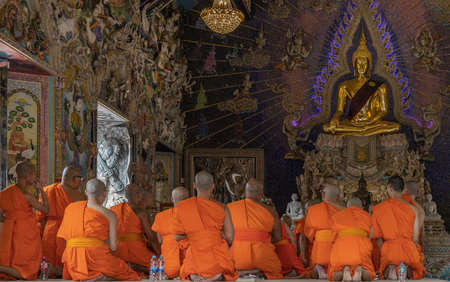 Bangkok, Thailand - 18 Aug 2019 : Chinese Thai monks praying for buddhism worship inside Wat Bhoman Khunaram (Bhoman Khunaram Temple).