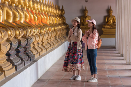 Asian couple girl traveler in thai temple