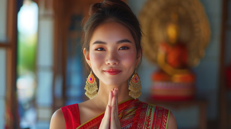 Beautiful young Thai woman in traditional suit smiles and gives wai greetings with her hands against blurry background