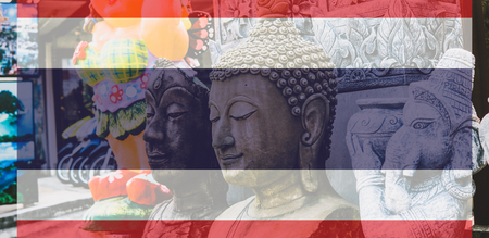 tourist symbols and places of Thailand on flag background.