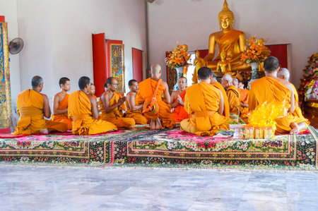 Ang Thong, Thailand - October 19, 2019 : Unidentified thai monk praying for religious ceremony in buddhist belief at Thai temple (Wat Thai)