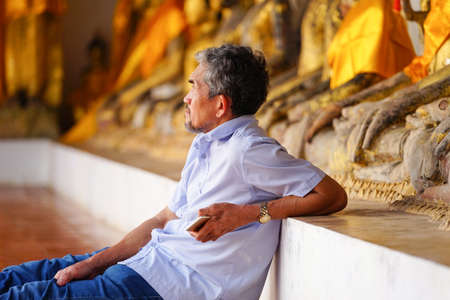 sad and depressed senior man sitting on the floor in the temple, concept elderly people depression spiritual,hope