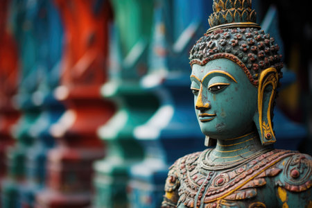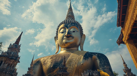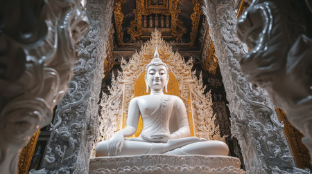 A majestic Buddha statue in an ornate temple setting evokes tranquility and spirituality. Beautifully crafted, this image captures the essence of devotion and peace.